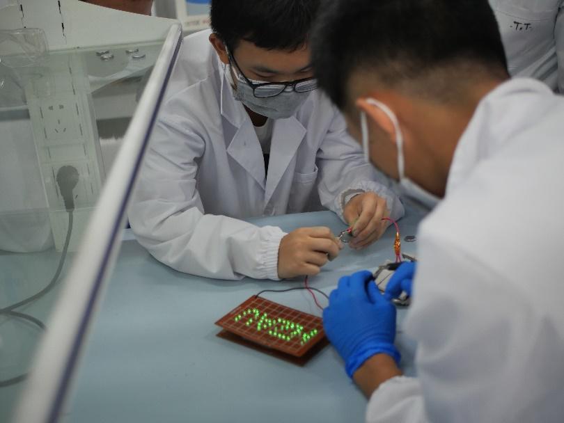 随后,同学们走进了实验室开展实验,亲手体验了从锌离子电池凝胶电解质材料制备到组装电池点亮灯牌的全过程,不仅加深了对理论知识的理解,更培养了他们的动手能力和团队协作精神。