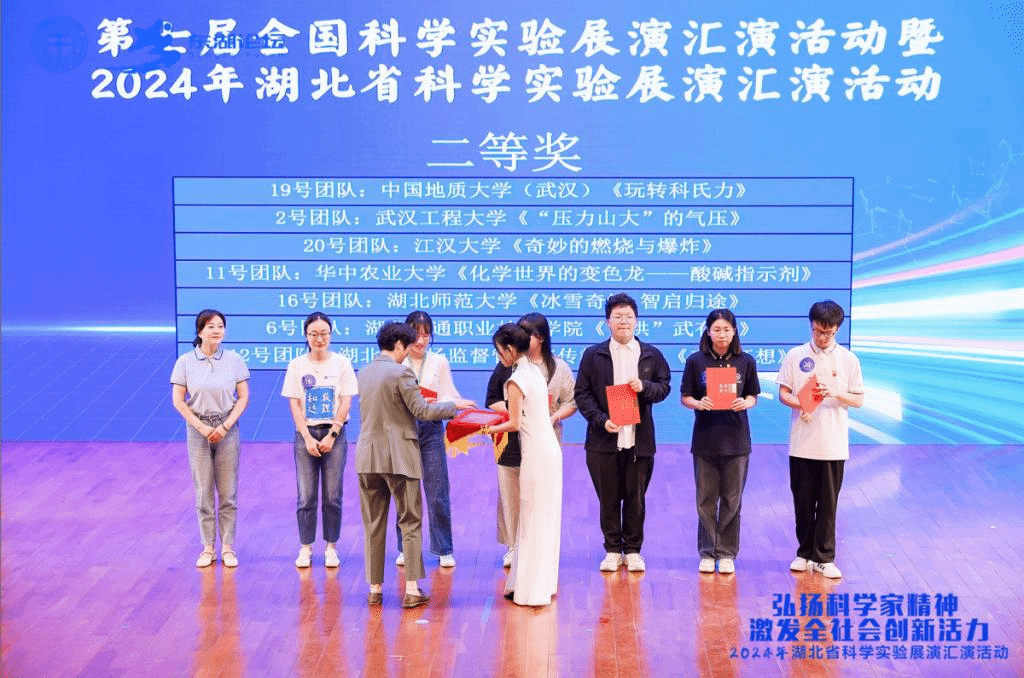 10月11日,第七届全国科学实验展演汇演活动暨2024年湖北省科学实验展演汇演活动在中国地质大学(武汉)举行。由搜同资源段丽君、叶小舟老师指导的田雨、赵雅楠、刘亚柠、侯庆哲四位同学组成的“化学变色龙”队荣获二等奖。