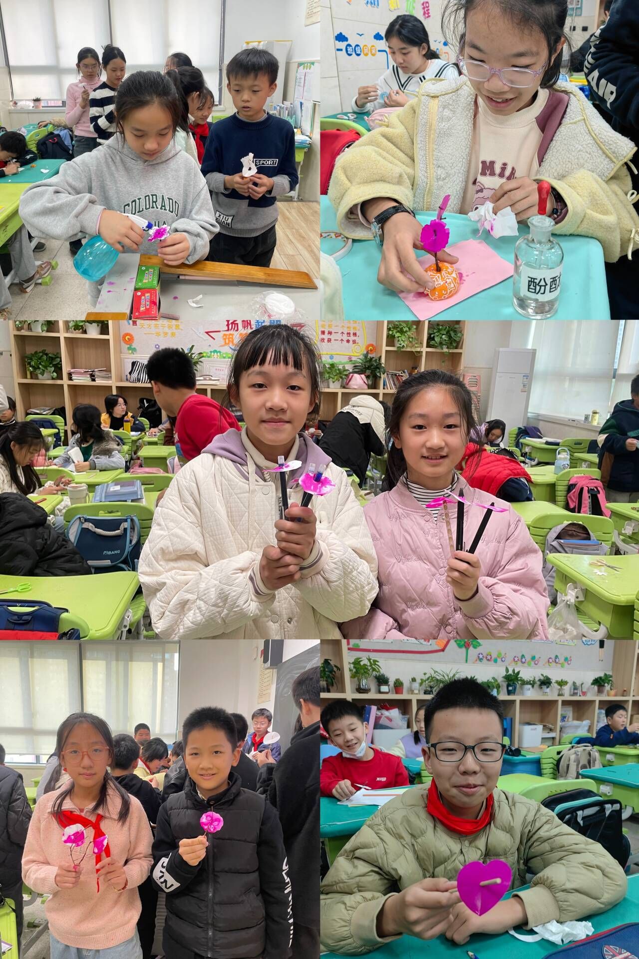 紧接着,老师们耐心地讲解了花瓣变色背后的原理:酚酞溶液是一种常见的酸碱指示剂,它在酸性环境下表现为无色透明,但在碱性环境就呈现红色。刚才喷壶里喷出来小苏打液体,就是一种碱性液体,酚酞一沾上小白花就秒变小红花了。六年级(1)班的同学们兴奋地说:“我没想到小红花的颜色变化背后竟然有这么多科学道理,真是太神奇了!”,“老师,那我们家里的其他花也会变色吗?”,还有小朋友兴奋地分享:“我回家后要告诉妈妈,我今天变成了一个小小的化学家!”。他们不仅学到了化学知识,还体验到了科学实验的乐趣。