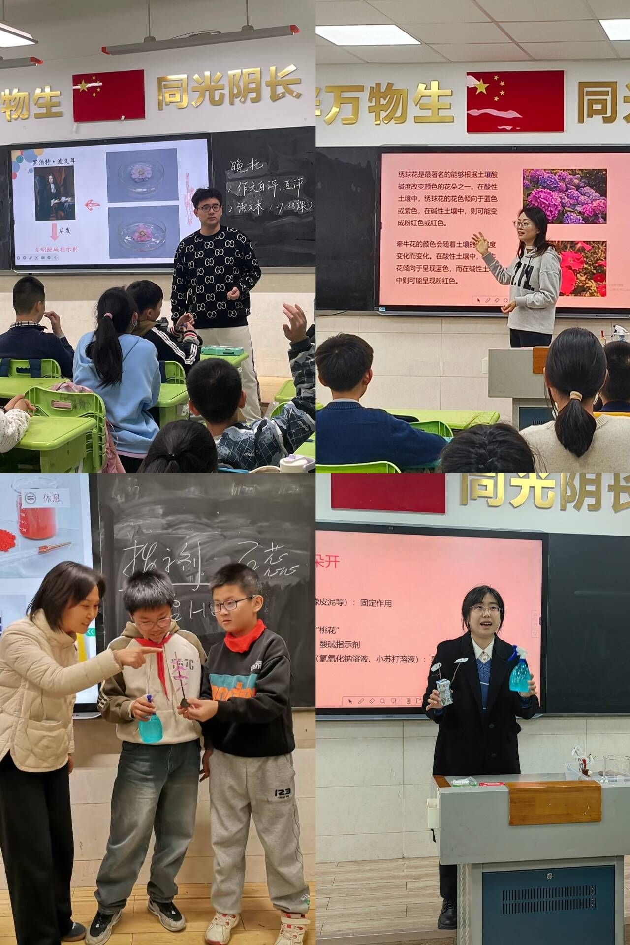 活动伊始,老师们讲述了罗伯特·波义耳的故事,这位被誉为现代化学之父的17世纪英国科学家,以其发明的酸碱指示剂而闻名。他从紫罗兰遇酸变色的现象思考探索,揭示了植物颜色的奥秘,进而发明了酸碱指示剂。老师们巧妙地将化学知识与自然现象相结合,让孩子们在探索中学习,在体验中成长。